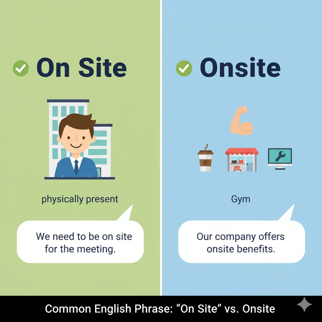 Now you know the clear difference between on site and onsite. Remember: on site refers to being physically at a place, while onsite describes something that exists or happens at a location. By practicing these simple rules, you can avoid common mistakes in writing, emails, reports, and daily conversation.
