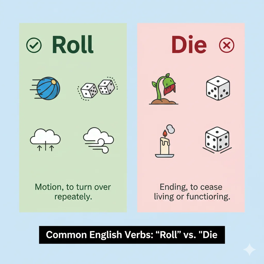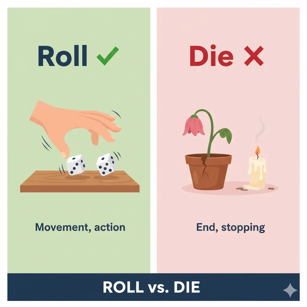 - Texting/online: Misusing die as roll can make sentences funny or confusing. E.g., “Roll the cake or it will die” clearly shows motion vs consequence.